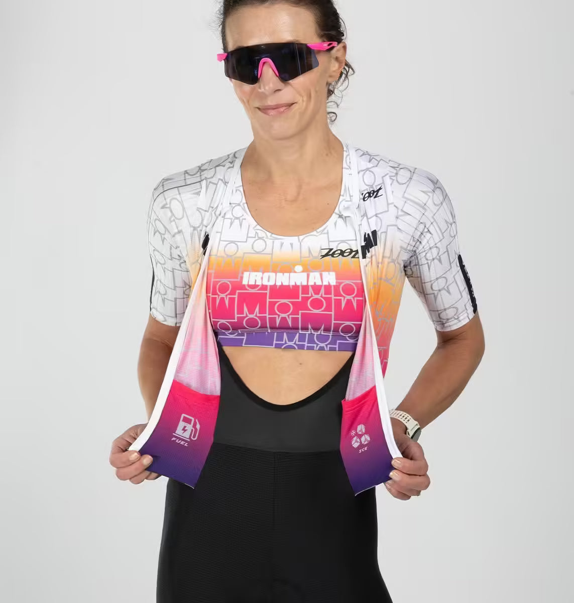 • Innovative cool storage technology for the race | Designed with internal ice storage pockets and cold sponges strategically placed in the suit to help keep your body temperature down. A Zoot innovation.